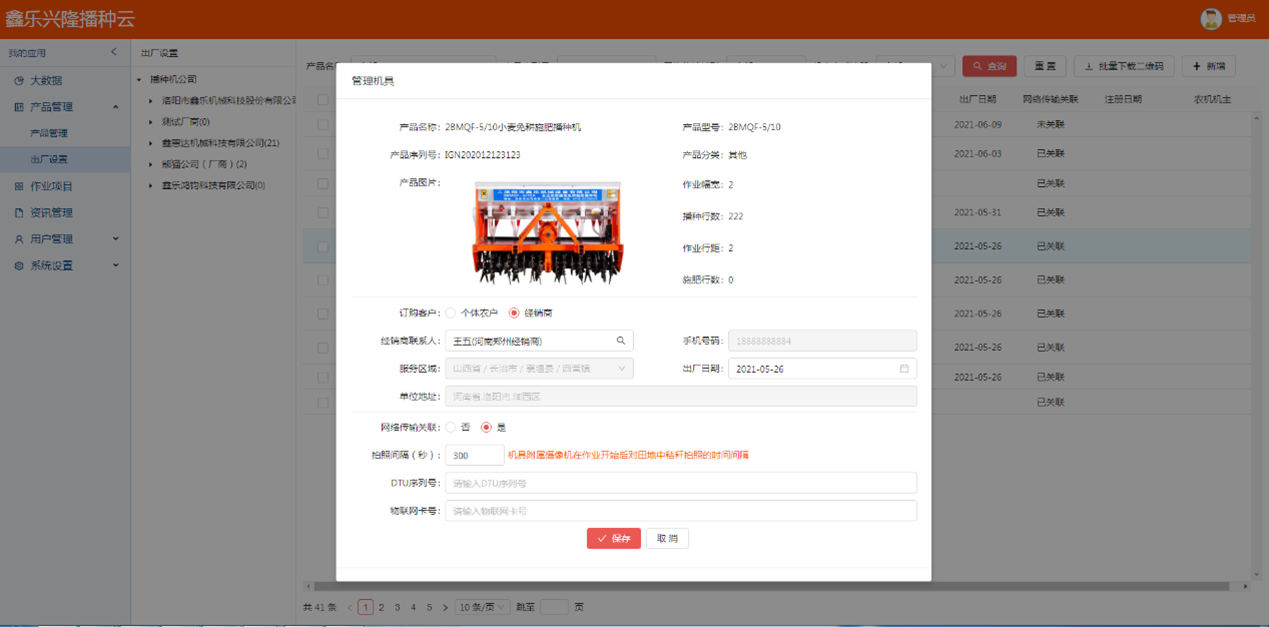 - 作業(yè)項目:為播種機(農(nóng)機)生產(chǎn)廠家和播種機(農(nóng)機)經(jīng)銷商提供作業(yè)項目跟蹤服務(wù)的功能。