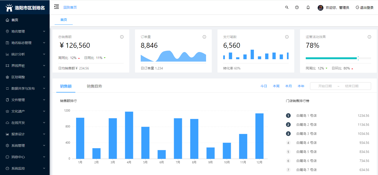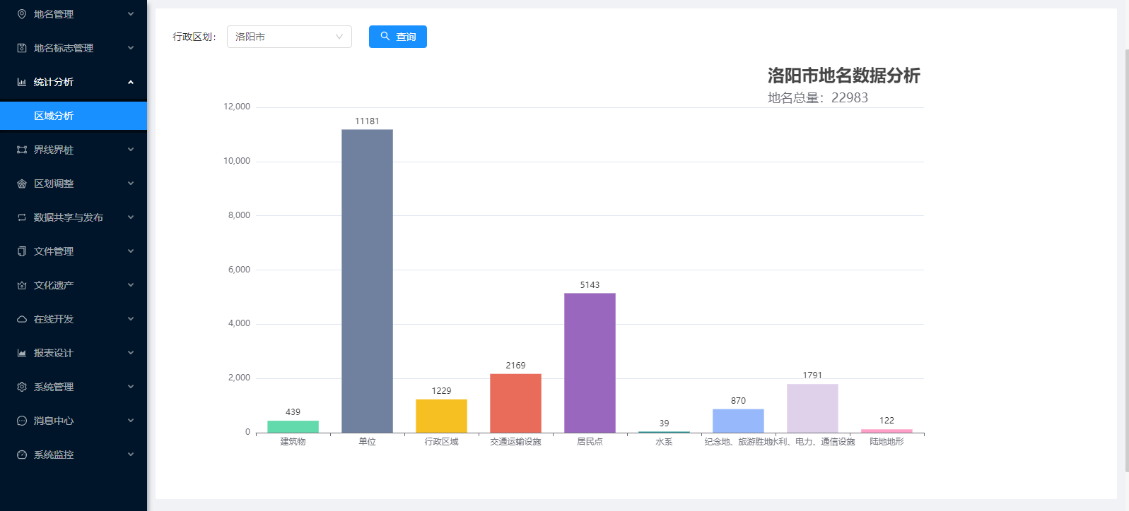 地名信息管理:地名管理、地名標志管理、統(tǒng)計分析