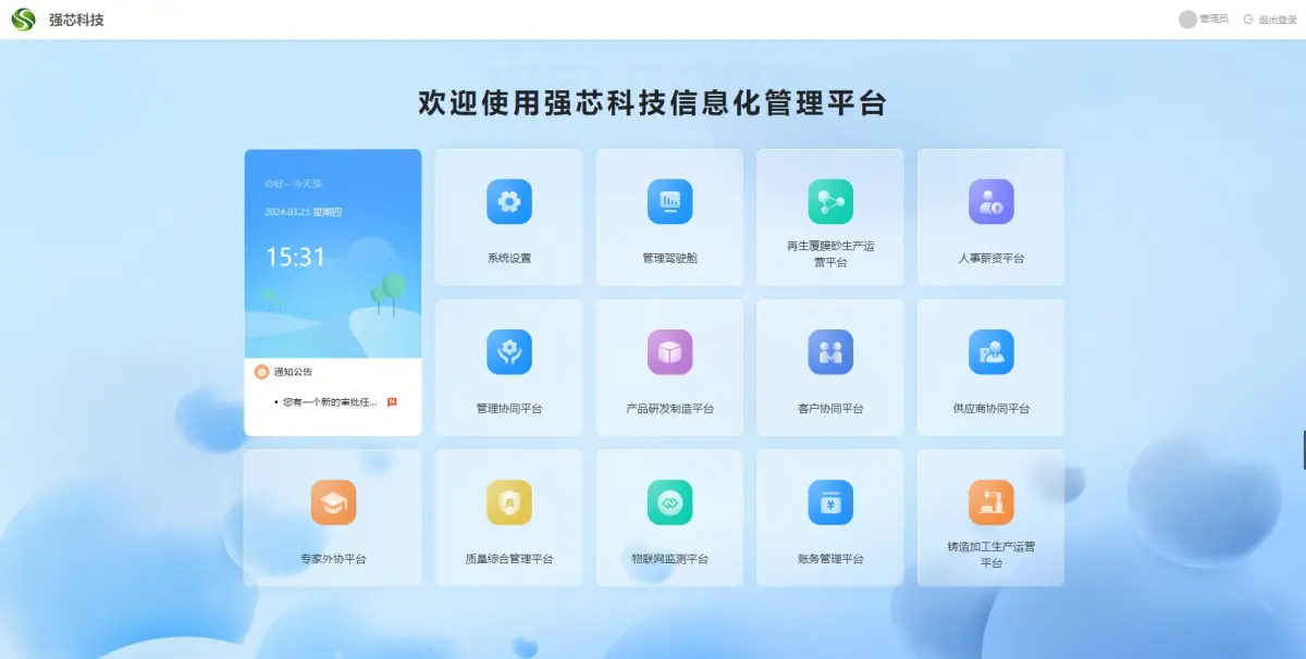 再生覆膜砂生產(chǎn)運(yùn)營平臺:工作日志、銷售管理、倉庫管理、采購管理、車間工廠、工作流、消息中心